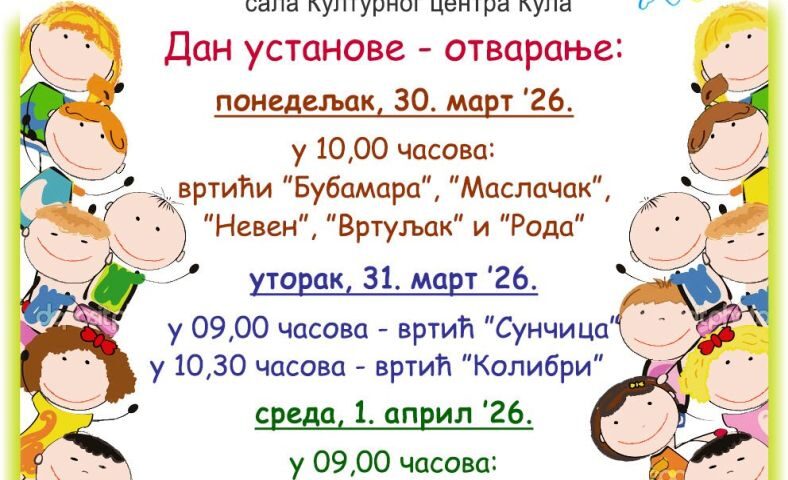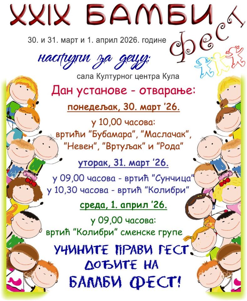 Сарадња са Сектором за безбедност у саобраћају5. март 2026. 29. Бамби фест 12. март 2026. У општини Кула одржаће се 29. Бамби фест у периоду од 30.03. до 01.04.2026. године. Позивамо вас да будете део ове лепе традиције, подржите најмлађе и уживате у дечијој радости, игри и стваралаштву. Учините леп гест – дођите на наш Бамби фест! Подели0 Повезани текстови5. март 2026.Сарадња са Сектором за безбедност у саобраћајуОпширније5. март 2026.Рецитаторска смотраОпширније27. јануар 2026.Традиционално обележавање славеОпширније