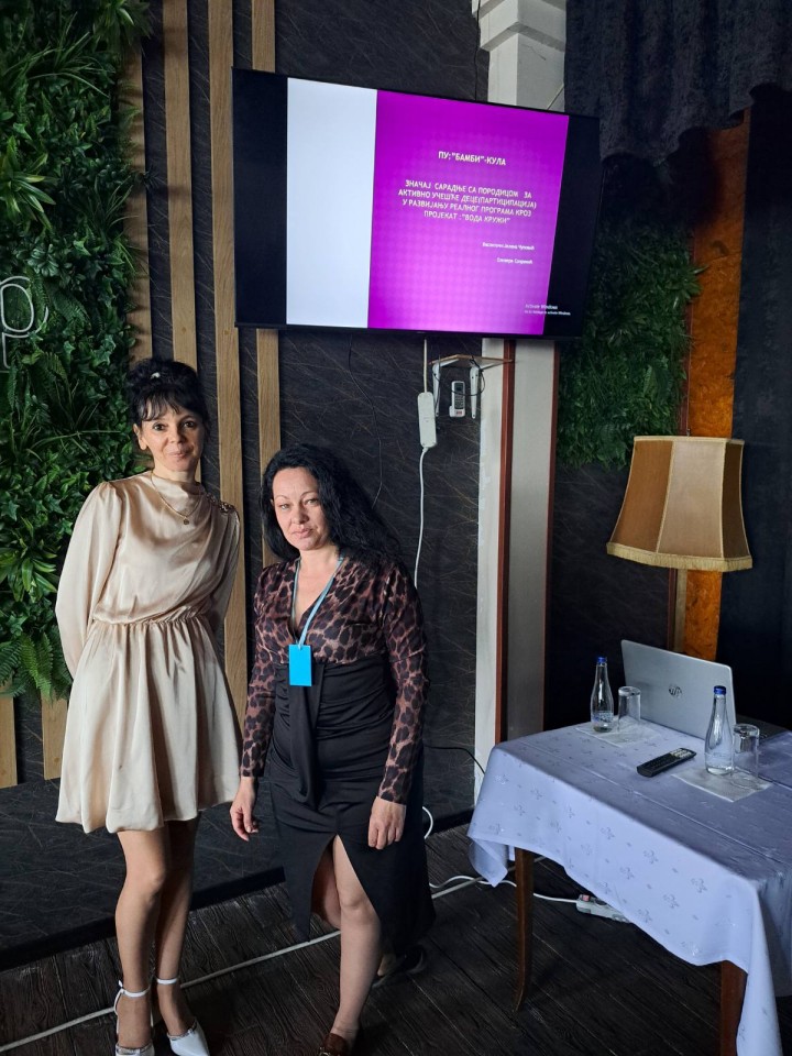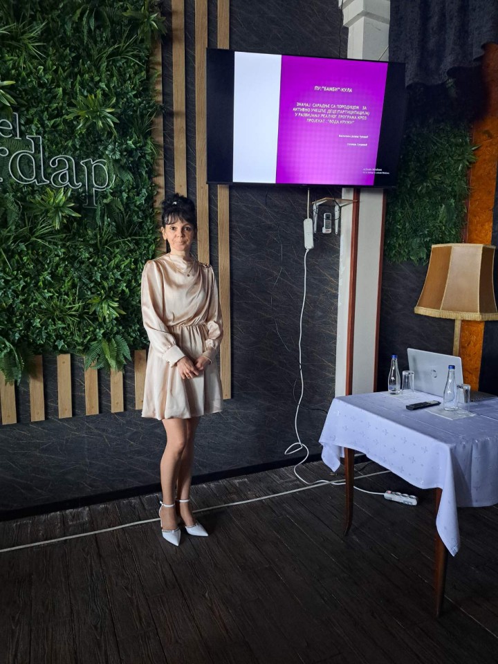 27. март 2026.На стручној конференцији за васпитаче у Кладову под називом „Улога васпитача у подстицању активног учешћа деце (партиципација) у развијању реалног програма, васпитач Оливера Сопренић је представила рад: Значај сарадње са породицом за активно учешће деце у развијању реалног програна кроз пројекат „Вода кружи“.
